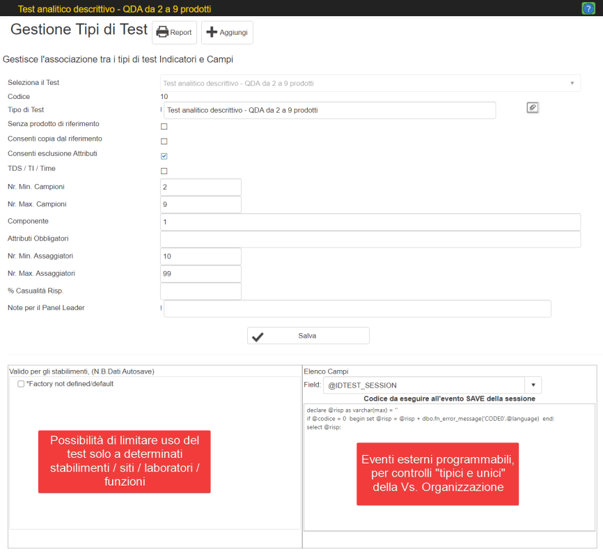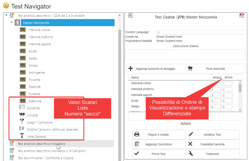 Il Tipo di test è l'elemnto base di analisi di Smart Gustent e questo puo essere configurato secondo le prroprie esigenze. Es. Se in un test monadico multiptodotto si vuole inserire, un descrittore di tipo discriminante Es. "Scegli il campione preferito" ciò sarà possibile ed in fase di reportistica/analisi il sistema riconosce il descrittore e lo tratta/processa in modo opportuno.